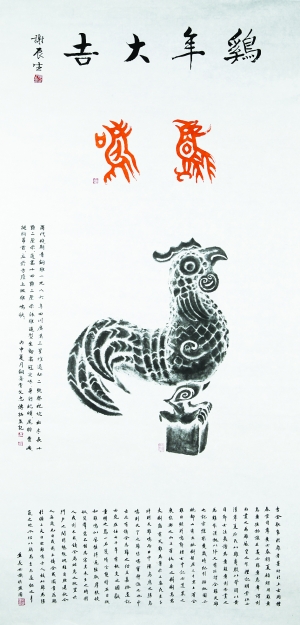 《鸡年大吉》青铜器全形拓,所选择的拓模对象是四川三星堆出土的一件“青铜鸡柱头”。据了解,民间的生肖文化起源于汉代,此前有关鸡造型的文物出土极少,这件鸡造型的青铜柱头,是目前青铜文物中最完美的。北京商报记者 徐磊