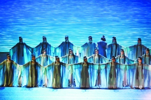 而在《拉纤歌》中,伴随着拉船号子一样的旋律,血色残阳缓缓移动,晚霞中船工们的形象形成了剪影,凝重而悲壮,而在《过瓜州闸》一折戏中,天幕上呈现了滔天巨浪的投影,配合干冰烟雾和倾斜的船体以及船工们的舞蹈,用写意的手法营造了过闸时的惊险气氛,再现了船工生活的艰辛与不易。