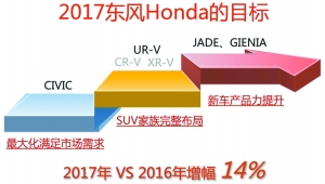 “聚力”的目的是“进取”。2017年东风Honda将导入更多新产品,加强涡轮增压、混动技术的运用,打造多层次产品体系;同时进一步强化品牌战略,全力提升品牌溢价力。最终保持高于行业两倍增速的发展,完成全年65万辆的销量目标,实现企业的全面进取。