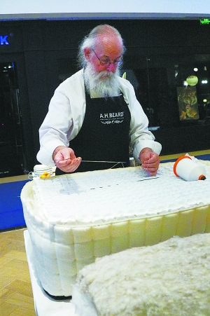 一位眉须斑白的老者,手持针线穿梭,所至之处,蓬松的填充层与棉质表层紧紧结合,一张床垫的轮廓渐渐出现。这是2017年3月12日出现在居然之家北四环店家之尊A.H. Beard比尔德床垫开业现场的一场手工缝制床垫表演,这位64岁的老者Navill是比尔德床垫最为资深的手工大师。通过一针一线的细细缝制,他向中国消费者传递的,是这个百年手工床垫品牌独特的魅力。