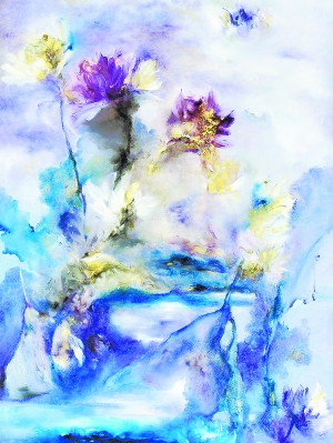 对此,吴晓玲介绍,她试图将月光暗夜中的空灵、落蕊的残色展现在青紫的背景上,营造出一种清冷之感,当中甚至还夹杂着细微的死亡气息,从而衬托出荷花虽残落,却独自在逆境中挣扎的坚强。这一创作中的想法来源于吴晓玲在创作中追求的“忘我”境界,无心笔耕,苦在身上,悲在心里,让颜色深浅叠加,使视觉恍忽游入无相,也是吴晓玲这些年学习佛法的一些体验,无心有境,本心自然,让她在绘画的过程中尽量神圣。