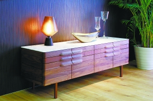 细观餐桌花纹,浅黑褐色略透庄严紫色,大抛物线花纹和波浪纹中略带“鸟啄痕”针结,让人感觉赏心悦目。轻轻触摸,触感细腻,宛若新生儿肌肤。丰富花纹和绵密触感,源于北美黑核桃木,这种被称为“木之贵族”的木材,常见于奔驰、宝马轿车的内部装饰,木质密度相当甚至高于优质红木,禁得住岁月的洗礼。