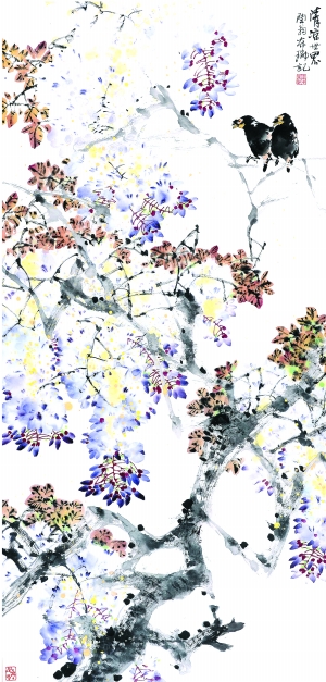 品读郭东瑞笔下的“花鸟世界”,总给人一种宁静中荡漾,在沉默中激昂的感觉,那充满思维的小鸟和赋有灵性的花草,仿佛使人真的置身于鸟啾水潺、花香树绿的世界之中,那一幅幅隽永的画面,就像是为观赏者打开的一扇扇小窗,让人们驻足观赏,溢于言表。白居易曾经有一句“感人心动者,莫过于情”的名言,郭东瑞是性情中人,从他的作品中不难读出他对大自然的温柔,或许在他这个已知天命的成熟画家心中,对世界的解释是另一番景象,但从他的笔墨中流露出的心性和感情,却能让观赏者感觉到真挚与心动。