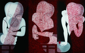 “创作《心经》系列时,在书写上我选择了密集的构图方式,这是为了展现出画面感。《心经》系列其实是对我灵魂和艺术结合的一种转变,是书写的构成与人物的结合。”童振刚说。值得关注的是,随着《心经》系列的实验,童振刚开始尝试在一些简朴的生活用品上加上一些与宗教有关的绘画语言,让它们富有禅意,而他作品中的形象也从早前的胖女孩转变成女人,代表着童振刚从过去的关注女性的貌相,转变成如今更多地去表达女性天性的母性、善良的精神世界。