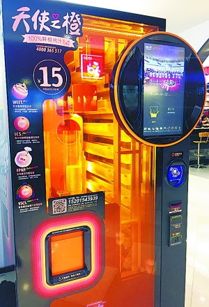 比起最开始自助售卖饮料的自动贩售机,如今的自助消费形式更是多种多样。例如商场和机场常见的自助现榨橙汁机,价格在15-30元一杯,支付后不到一分钟的时间即可在取货口取到一杯现榨橙汁。让不少消费者放心的是,比起果汁饮料在柜台后的工作间操作这种不可视的过程,自助现榨橙汁机面对消费者的一面是部分透明的,橙子从上层的存放格里到进入工作程序开始削皮、榨汁,部分环节完全可视。此外,北京商报记者还对比了不少商场内的果汁饮品店,一杯现榨橙汁的价格也在30元上下。
