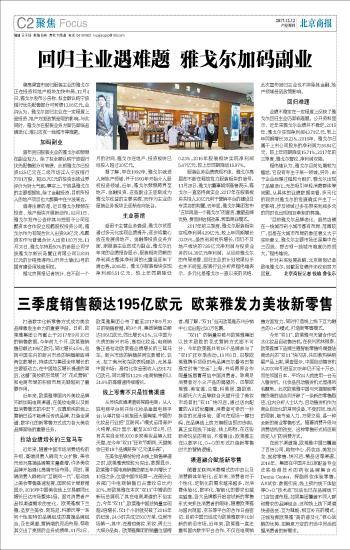 近年来,随着中国市场消费结构的升级,高端消费人群向大众扩散,美妆市场对高端品牌需求量激增,许多美妆品牌开始强化高端市场布局。同时,高端消费人群转向“互联网一代”,驱动线上美妆零售高速发展。国家统计局数据显示,2016年中国美妆线上交易额同比增长已达市场整体4倍。面对消费者产品和渠道需求的变化,欧莱雅旗下兰蔻、圣罗兰美妆、阿玛尼、科颜氏等一系列个性独特的品牌组成的高端品牌组合,及在渠道、营销端的灵活布局,帮助其交出了亮丽的业务成绩单。11月2日,欧莱雅集团公布了截至2017年9月30日的销售数据。前9个月,集团销售总额达195亿欧元,同比增长4.5%。以中国为代表的新兴市场、高档化妆品、电商销售正是拉动欧莱雅业绩增长的三驾马车。新兴市场的销售获两位数增长,亚太、拉丁美洲和东欧表现强劲,尤其是中国市场;高档化妆品部收入达61.72亿欧元,同比增加13.2%;电商销售则以31.6%的高增速持续增长。