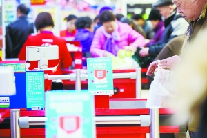 记者看到,上午10点左右,北京家乐福的收银口都排了20米以上的长队,结账速度较快,10分钟能够完成。很多人的购物车里都有大米、食用油、肉类,还有餐巾纸等等,以生活用品居多。