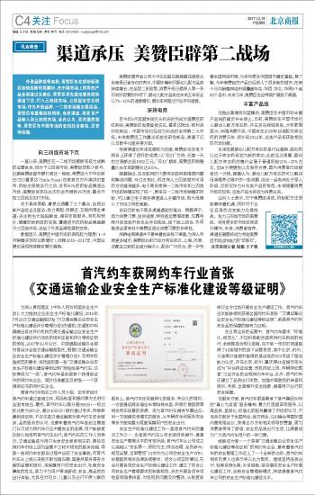 首汽约车获网约车行业首张《交通运输企业安全生产标准化建设等级证明》