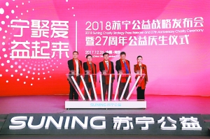 在召开的2018苏宁公益战略发布会&27周年公益庆生仪式中,苏宁控股集团董事长张近东表示,2018年,苏宁拟将行业首创的精准扶贫实训店扩展到至少100个贫困县,并成立专项扶贫基金,全面保障精准扶贫项目的规模化落地、效益化发展。2017年,苏宁通过专业扶贫、产业扶贫,将苏宁公益覆盖到赈灾扶贫、捐资助学、养老抚孤、环境保护等多个领域。