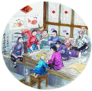 杨信:相比其他题材的绘画,我的老北京题材作品内容可能更加丰富,人物、建筑、配景等不同的素材都需要去细心营造、设计,这要求自己掌握不同的绘画技巧和表现方式。比如建筑,它是民俗绘画重要的题材,但不同的房子有不同的特点,从王府、皇宫、生意人、士子到平民百姓,均需要研究透,在画面中务必得符合他的身份,符合整个的生活环境,此外,胡同的配景,街市构图的好坏对于作品的整体效果完成都有着直接的影响。