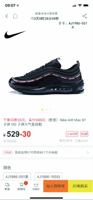 2月12日,北京商报记者接到了来自张先生的投诉称,一个名为“闪电降价”的电商平台近期频繁在微博、今日头条、腾讯视频、UC和抖音等热门社交或媒体平台推广折扣商品,于是尝试在该平台上购物,买了一双市价数千元的联名款耐克鞋Undefeated×Nike Air Max 97,平台上显示的“新客专享价”仅为499元。据了解,Undefeated×Nike Air Max 97系列于2017年9月发售,发售价为180美元,约为1135元人民币。目前,该鞋款的代购市场价为4000元人民币,以此计算,闪电降价平台的价格相当于市场价的1折左右。
