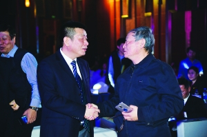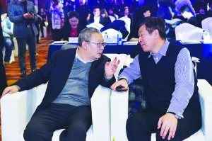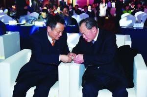 北京市商务委员会委员王洪存(左)与中国商业联合会会长姜明在会场内交流