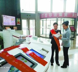 在中行北京分行的营业网点内,“远离高利诱惑、拒绝非法集资”的宣传海报张贴在显著位置,LED屏滚动播放着防范打击非法集资的宣传标语;大堂人员向前来办理业务的客户介绍消费者权益保护金融知识,还发放防范打击非法集资宣传折页和对联、福字、年历等带有节日元素的消费者权益保护宣传品,受到了客户的普遍欢迎。