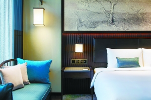 北京诺金酒店共有438间客房及套房,客房内落地窗设计,光线充足,视野开阔,可欣赏无限城市风光。客房设计灵感亦来自明代文人居所的典雅精致,参拜明代文士文震亨所著《长物志》中提倡“制具尚用”的功能性设计理念,布局设计在力求取得平衡与对称基础上,维持了纯朴的舒适感。房间内明确地划分出工作、娱乐、放松、睡眠及卫浴区域,在保证每个区域独立性的基础上,又不破坏空间的连续性与整体设计感。低调奢华的家具以实木和皮革制品为主,点缀以宝石色调的配饰;丝制图案背景墙与实木及大理石地板相得益彰;非对称的浮云图形为宾客带来自然感受,如《长物志》中所提及,为“幽人眠云梦月”的理想居所。