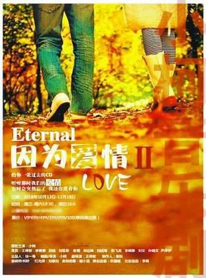 音乐剧 | 《因为爱情2》 时间:10月13日-11月18日 地点:小柯剧场 简介:20年前,老秦(小柯饰)被分配到一所高中教书,却意外和班上的女生温晓蕾产生了感情。后来,温晓蕾怀孕随一家人去了美国,从此杳无音信。老秦开始正常生活并娶妻,不料妻子生产时发生意外成为植物人……
