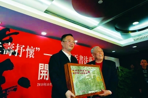 10月20日,“米寿抒怀·夏湘平书法艺术展”在新闻大厦艺术馆开幕。八十八岁,俗称米寿,此次书展是艺术家抒米寿之怀,展出了其50余幅以原创诗文及个人生活杂记为内容的作品,全部来自于近两年的新作,他以真、草、隶、篆等不同书体、不同形式来呈现,艺术再现了书法家精彩的人生历程。同时,这也是夏湘平继2015年“砚边八十年”书展之后,又一次向观众提供的一场书法视觉盛宴。来自部队、政府机关、艺术协会、新闻媒体的嘉宾陈广文、阳安江、李德亮、张志刚、常克仁、夏潮、沈宝昌、张海、林岫、申万胜、胡抗美、刘洪彪、李翔、郑晓华、邱成军、彭宇等200余人出席了开幕仪式。在活动现场,中共汨罗市委书记喻文向夏湘平赠送了《离骚碑》拓片。据喻文介绍,夏湘平曾和汨罗、屈原结下过不解之缘。“夏老多次到过汨罗,为我们写过三幅巨作。今天来,是把夏老于1992年给我们书写的碑的拓片赠送给他。” 在展览开幕之际,还举行了《米寿抒怀·夏湘平书法作品集》首发仪式。此次展览由北京商报社联合中国书法家协会艺术委员会、荣宝斋出版社、中国画艺术研究院共同主办。
