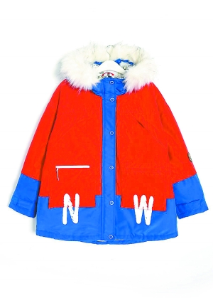 采用100%聚酯纤维面料,设计复古红蓝撞色,舒适衬里趣味印花,毛领可拆卸,下摆抽绳调节。