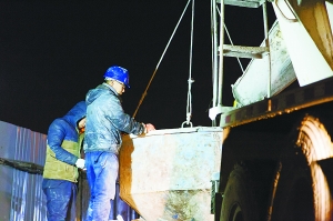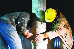 夜已深,虽说北京初冬的寒风还不刺骨,但室外实时温度已达到零下5摄氏度。深入大羊坊桥匝道施工工地,不少工人身上的衣服都被汗水浸湿了。作业点上刚刚换下了白班工友的胡海正与同事忙碌地进行着管线连接。虽然工地现场机械化程度很高,但在灌注桩作业期间,工人们仍需与吊车配合,手工将3米多长的灌注桩连接固定并埋于地下。在胡海熟练的技巧下固定环转得飞快,很快便成功连接了两节灌注桩。气温降到零下,钢材质的灌注桩也变成了凉气逼人的“大冰块”,专注工作的工人们为了能把握好手中的力度,手上只戴了一双线手套。“线手套能够掌握好力度,厚一点的手套虽然保暖,但是工作起来不方便。”胡海向记者解释。