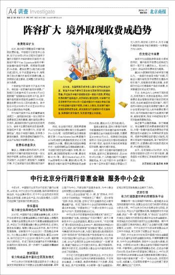 近日,部分银行调整信用卡境外取现收费标准。中信银行日前发布公告称,拟于2019年4月11日起对仅适用于境外交易的外卡组织单标识信用卡(包括但不限于Visa Signature信用卡等)收取境外取现手续费,按照取现金额的3%收取,最低收费为3美元或30港元或3欧元。对于出国留学生卡,每账单月免1次境内外取现手续费优惠。北京商报记者注意到,在调整之前该项业务为免费。