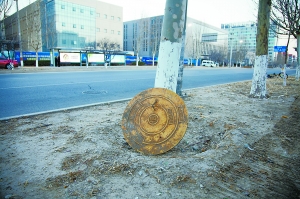 德上科技园东北门向北约20米,一个写着“北京电信”的黄色井盖倚靠在树上。井盖在这里,配套的电缆成了“坑”,存在很大的安全隐患。
