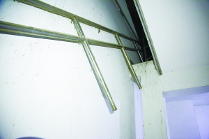 1月17日,BDA嘉捷企业汇九号楼1单元楼门口上方,一根扶手悬空摆放在间隔中,随时会掉下来砸伤行人。