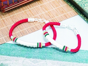 在红绳上一般都会搭配转运珠、行运珠(材质一般为足银、黄金这些比较传统的贵重金属),或者貔貅玉饰、元宝、钱袋、葫芦、铃铛等这些在民族传统里招财行运的象征挂件,潘家园礼物店内就有多款适合本命年佩戴的红手绳。
