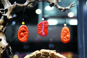 首先,这类造假品的首要特征是每颗看起来都一样,过于雷同。缟纹条带明显,条带处的颜色比其他地方明显浅,是烧色不均造成的。用强光手电透光照,看不到三氧化二铁的“朱砂点”状结构。此外,在放大镜下观察时,这种仿制品表面有深红色的牛毛纹,牛毛纹长度大概1-3毫米,是烧色时炸裂造成。