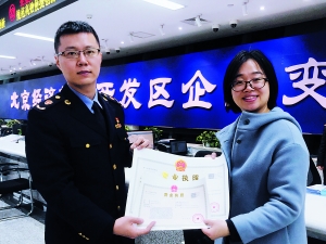 3月1日,外商合资企业拜耳医药保健有限公司负责人从开发区工商分局工作人员手中接过了开发区首张新版营业执照,标志着新版营业执照在开发区正式启用。