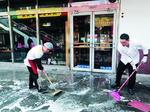 当天下午,在街道工作人员的号召下,上海沙龙商圈的物业、临街商户纷纷响应,拿出笤帚、拖把、水盆等清洁用品走出店门,对自家门前堆积杂物、地面上的灰尘污渍进行清理。大家分工明确,有的负责提水、倒水,有的负责洗地,有的用抹布清洗栏杆。“组织商圈商户开展集体大扫除的想法来自社区开展的‘周末大扫除’活动。”荣华街道城建科科长李鹏介绍,去年,荣华街道各社区轰轰烈烈地开展了“周末大扫除”活动,取得了良好效果,而上海沙龙商圈也在经过此前的疏整促工作会后脱胎换骨,以一个崭新的面貌出现在辖区居民面前,商圈品质得到大幅提升。于是,为进一步巩固整治成果,街道决定以该商圈为试点,将“周末大扫除”模式由社区向商圈延伸,从而带动商户参与到商圈环境提升工作中,共同努力让商圈的环境越变越好,并增加商户归属感。