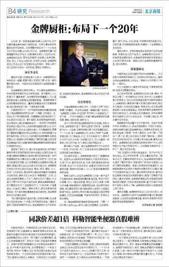 “我们要把厨房打造成中国人的烹饪神殿,在这里可以找到适合每一个中国人的完美烹饪体验。”潘孝贞宣称,在厨房领域的专业化,是金牌厨柜永远不变的标签,发起新的厨房革命,是金牌厨柜未来20年坚定不移的战略。