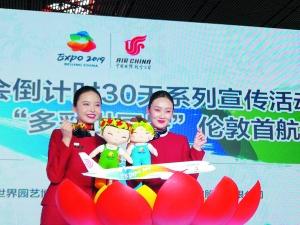3月31日14时,北京世园局与北京世园会全球合作伙伴中国国际航空股份有限公司在北京首都国际机场T3航站楼共同举办了 “北京世园会倒计时30天系列宣传活动之国航A350‘多彩世园号’首航伦敦仪式”。