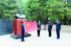 今年是中华人民共和国成立70周年、五四运动100周年。为激励和引领广大青年大力弘扬以爱国主义为核心的伟大民族精神,日前,朝阳区市场监督管理局团委赴日坛公园马骏烈士墓开展“青春心向党 建功新时代”主题团日活动,共21名青年干部参与活动。全体团员面对团旗重温入团誓词,合唱《我和我的祖国》,共同歌唱祖国的繁荣富强。