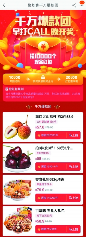 “对商家而言,千万爆款团就是上半年增长的最大机会,对消费者而言,千万爆款团就是上半年最大力度的折扣优惠。”家洛表示。作为拼团始祖,聚划算自诞生以来就以强大的消费者号召力而著称,曾无数次上演数十万人、数百万人乃至数千万人抢购同一爆款的盛况,创造了全网最多的单坑千万级成交爆款和“亿元爆款”的纪录。去年“6·18”期间,聚划算创造的“千万级爆款”就有66款。