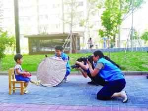 早晨8点刚过,社区小广场上就已经热闹起来,几位家长带着孩子排队等候拍照,社区党支部、服务站的几位工作人员也早已就位,张罗着报名的家长签到。此时,一旁绿茵茵的草坪上也已进入拍摄状态,社区党支部的一名党员正手托相机蹲在草坪外为面前的“小模特”拍照。摄影爱好者梅文栋和刘海彬也相互配合着,一人拿着反光板站在小朋友身边打光,一人不停变换着角度,试图用相机镜头捕捉到孩子的每个灵动瞬间。家长们也不闲着,一起参与到“逗乐”队伍中,配合社区党支部、服务站的工作人员,躲在镜头背后想尽各种办法逗孩子们开心一笑。