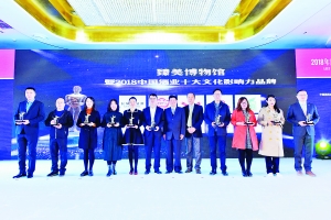 | 中国经济传媒协会会长赵健(右六)、北京商报社副社长李雁兵(右五)为臻美博物馆(暨2018中国酒业十大文化影响力品牌)获奖企业颁奖。 |