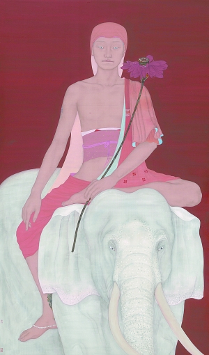 对于高古的东西,祝铮鸣有一种天生的迷恋。魏晋的风雅古拙、隋唐的恢弘大气,尤其是佛造像、隋唐陶俑庄严肃穆的气息与形式美感,让祝铮鸣的创作开始走向一种纯粹。绘画中的人物往往处于一种“冥想”状态,剥离了欲望,摒弃了烟火气,画面所传递出的哲学思考和精神隐喻常使人产生“遁入空门”的误读,其实祝铮鸣的绘画只是一种近乎于禅学的精神纯粹。禅宗和佛学会对她有所启发,但画面所体现出的神圣感完全是无意识的,在祝铮鸣看来,创作也是一种修行,画中人物脱落身心的精神状态也是她内心想要达到的一种状态。