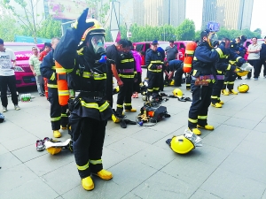 当天早晨7点刚过,各微型消防站的队员们便已陆续来到现场,红色微型消防车一字并排排开,场面十分壮观。由各物业工作人员及保安组成的微型消防站队员们站在各自的消防车旁准备着装备,和队员们轻声交流着待会技能比武的流程和要点。比武正式开始前,开发区消防支队的消防战士再次为大家讲解、演示了消防装备的使用方法及要点,普及应对初期火灾及人员救援的基础知识。随后,技能大比武的第一项内容——原地着消防战斗服,在消防战士的一声“开始”口令中拉开序幕,只见各微型消防站的队员们快速一个抬脚伸进消防服的鞋子,然后起身向上一拉背带几秒钟就穿好了战斗服的裤子,转身换个观摩位置的功夫,一位年轻的小伙子便已穿戴完毕举手示意裁判员。接下来的氧气瓶装备穿戴和消防车水带技能比拼中,大家也各个铆足了劲头,结合自己日常训练所学和消防战士刚才的培训,认真地按照标准逐一完成。