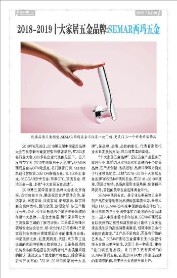 2019年6月28日,2019第三届中国家居品牌大会在北京新云南皇冠假日酒店举行,在200多名行业大咖、600多名企业代表的见证下,公开发布“2018-2019中国家居十大品牌”,SEMAR西玛五金与OPK欧派克、名门静音门锁、Kaadas凯迪仕智能锁、SFOR赛福五金、HUTLON汇泰龙、REGGAR乐卡五金、东泰DTC、顶固五金、雅洁五金一道,上榜“十大家居五金品牌”。