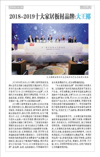 2019年6月28日,2019第三届中国家居品牌大会在北京新云南皇冠假日酒店举行,在200多名行业大咖、600多名企业代表的见证下,公开发布“2018-2019中国家居十大品牌”,大王椰与万华禾香板、露水河牌刨花板、千年舟、卢森家具板、泊诺思、拜勒尼、鹏鸿、爱格板材、大亚板材一道,上榜“十大家居板材品牌”。