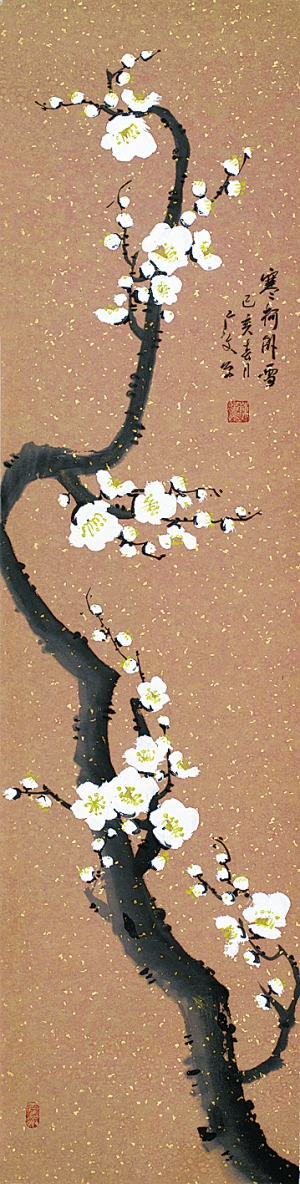 梅花,在大雪中昂首挺胸,不畏严寒,不与群花争艳,默默地绽放在凛冽的冬里,身居寒冬,心怀春天。绽放的梅花如天际晚霞,嫣红霞帔。正因如此,陈广文先生对梅花情有独钟,并达到如醉如痴之境地,作品中呈现出一股君子之气。陈广文先生说:“正因为我一直喜欢阅读赞美梅花的诗词,喜欢梅花高洁、清香的韵味和凌寒傲雪、俏不争春的品格,所以特别喜欢画梅花。”十几年来,陈广文先生喜沉于躬耕笔墨田园,尤以梅花作为自己的创作题材,如今已成果蔚然。