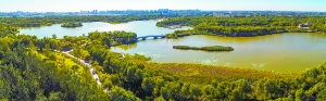 在南海子公园二期建设中,清运垃圾后出现了一个个沙坑,在沙坑的基础上建起了一个个湖区,使公园二期的湖区面积达1平方公里,占二期总面积的将近1/6。据孙康介绍,湖水的水源是小红门污水处理厂,每天有30万吨水经过水厂处理后,泄放到公园湖区中,在公园中得到进一步净化。在湖区的设计中,实现了降低入湖水源径流速度,增强了曝气时间,同时培养了大量水草及鱼类,都可以起到吸收、吞噬水中重金属的作用,“水体在污水处理厂处理的基础上,在公园中得到了进一步净化”。孙康说,每天将30万吨净化后的水体排入河道,供公园下游植被灌溉之用,让水资源变得充沛。