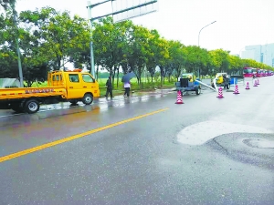 “荣华中路一处树枝折断,挡住了一条辅路。”7月28日凌晨4点,亦庄新城园林绿化公司应急处置组接到巡查人员发来的信息,便组织一个应急处置组到现场处理,经过10多分钟的冒雨处置,恢复了道路通行。