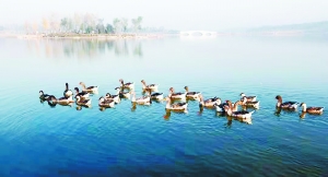 “陂塘雁影”源自明末清初著名诗人吴伟业在《海户曲》中的诗句“芦苇陂塘雁影来”。该景观设在公园一期湖区西北岸。这里芦花荻荡,凫雁翔集;荷花争艳,栈道逶迤。游客们可以近闻呦呦鹿鸣,远望玉桥横卧。漫步于亲水栈道上,好似在画中游览。