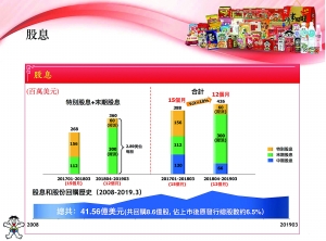 由于取得了良好的业绩,旺旺向股东持续派息。2018财年12个月拟派息额超2017财年15个月总额。
