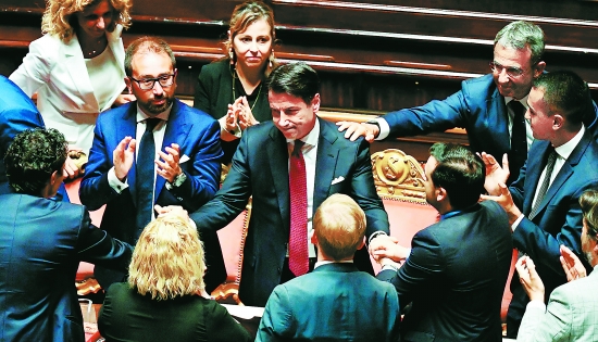 20日,意大利总理孔特(中)在参议院发表讲话后准备离开。