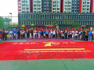 本次活动也是该社区的新时代文明实践日活动之一,活动以“青春心向党 共绘中国梦”为主题,以社区在职党员志愿服务为载体,组织社区6-12岁的亲子家庭共同参与沙画绘制。记者在现场看到,活动共吸引了30多组家庭百余人参与。偌大的网球场上,孩子们在父母的陪伴下,大手挽着稚嫩而灵巧的小手用彩沙流淌出一幅热爱祖国、青春向党的画面。一张张灿烂的笑脸、一屡屡流淌的彩色,无不诉说着社区青少年们对伟大祖国的热爱,对祖国的祝福。当祝福图案绘制完成,居民们围站在沙画四周,挥舞着五星红旗,齐声合唱《我和我的祖国》,唱响对祖国的热爱,激情洋溢的画面令人动容。