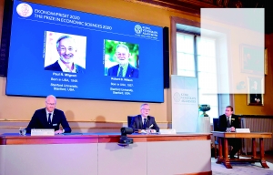 当地时间2020年10月12日,瑞典斯德哥尔摩,2020年诺贝尔经济学奖揭晓,获奖者为保罗·米尔格罗姆和罗伯特·威尔逊,以表彰他们“对拍卖理论的改进和新拍卖形式的发明”。(见8版)CFP/图