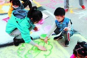 在现场工作人员的帮助下,小朋友们拿着彩沙在地上一一对应画出大骨头、树叶、废弃电池等,不到两个小时,原本空白的地面就变得五彩缤纷,生动有趣。