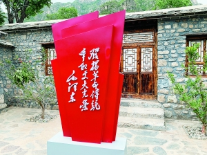 不仅如此,沿着108国道一路北上,在路北边就可以看到一面鲜红的金属质党旗,几乎覆盖了整个山坡;在房山区霞云岭乡堂上村村口,一根19.21米高耸的擎天柱矗立眼前,它们就是《没有共产党就没有新中国》发源地的两个标志性建筑物。
