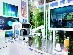 在建行展厅,一个智能机器人咖啡机引来众多观众围观。展厅工作人员向北京商报记者介绍称,“只用1元钱,使用数字人民币支付,我们的AI机器人就可以给您做出来一杯拉好花的咖啡”。